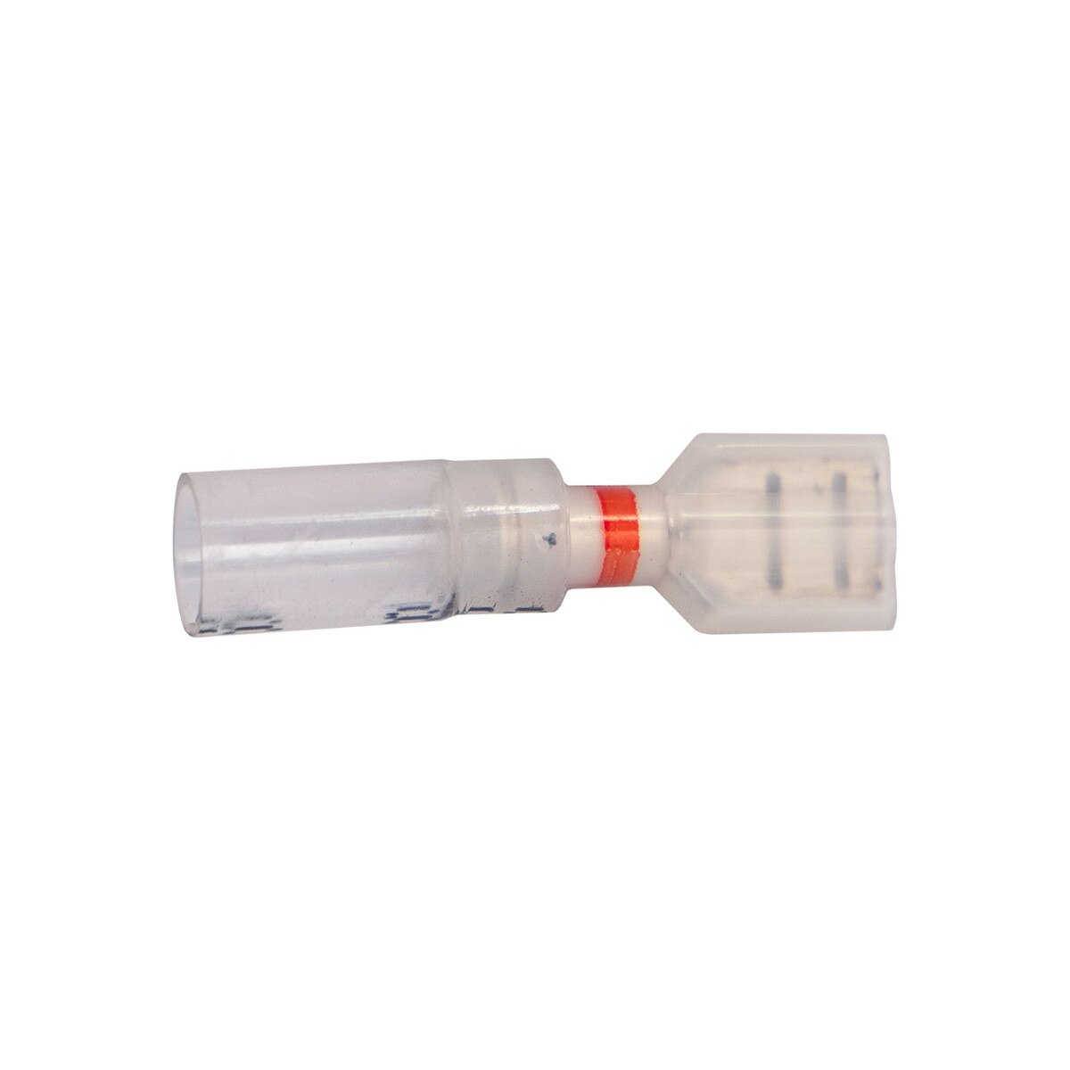 Fully Insulated Quick-Connect Crystal Clear Terminals, Wire Gauge (AWG): 22-18, Color Stripe: Red, Tab Size & Thickness: .250″ x .032″ (.80MM), Type: Female